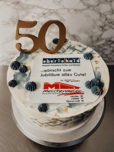 Im Zuge eines Firmenjubiläums hatte ich die besondere Ehre für die Firma Eberle-Hald Dienstleistungen Metzingen GmbH, eine individuell gestaltete Torte als Geschenk anzufertigen. Die einzigen Vorgaben: die Integration der beiden Firmenlogos sowie der Zahl „50“ – alles Weitere lag in meinen kreativen Händen. So entstand ein einzigartiges Tortendesign, das nicht nur geschmacklich, sondern auch optisch begeisterte.